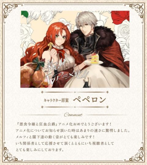 同作は、とある趣味のせいで、ほかの貴族から避けられている伯爵令嬢のメルフィエラ、“狂血公爵”という不名誉な二つ名を持つガルブレイス公爵による恋あり、バトルあり、グルメありの恋愛ファンタジー。