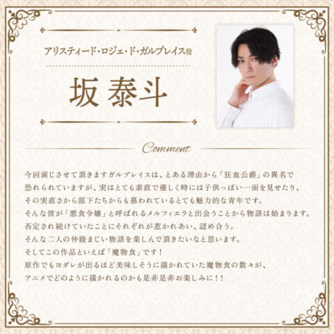 講談社のマンガアプリ「Palcy(パルシィ)」やウェブサービス「pixivコミック」で連載中の「悪食令嬢と狂血公爵~その魔物、私が美味しくいただきます!~」がテレビアニメ化され、TBS、BS11で2025年4月から放送されることが分かった。講談社Kラノベブックス(講談社)の星彼方さんのライトノベルのコミカライズで、“悪食令嬢”のメルフィエラ・マーシャルレイド役の中村カンナさん、“狂血公爵”のアリスティード・ロジェ・ド・ガルブレイス役の坂泰斗さんが出演することも発表された。アイドルグループ「AVAM」がオープニングテーマを担当する。