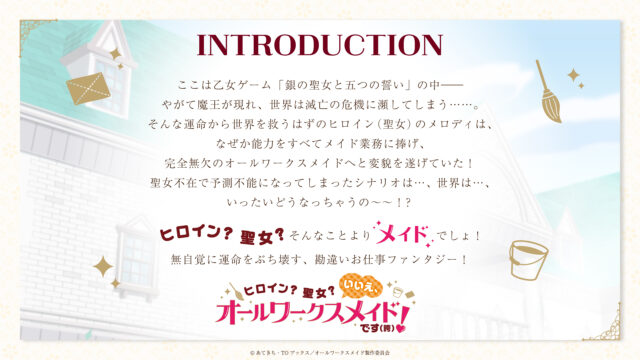 同作は、あてきちさん作、雪子さんイラストのライトノベル。乙女ゲーム「銀の聖女と五つの誓い」で、世界滅亡の危機を救うはずのヒロイン(聖女)のメロディは、なぜか能力を全てメイド業務にささげ、完全無欠のオールワークスメイドへと変貌を遂げる……というストーリー。聖女不在でシナリオが予測不能になってしまった乙女ゲームの世界が描かれる。TOブックスからライトノベルが刊行されており、コミカライズも人気を集めている。シリーズ累計発行部数は50万部以上。