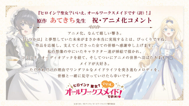 あてきちさんは「アニメ化、なんてうれしい響き。『いつかは』と夢想していた未来がまさか本当に実現するとは、びっくりですね。作品を応援し、支えてくださった全ての皆様へ感謝申し上げます。私の想像の中にいたキャラクターたちが挿絵で描かれ、コミック、オーディオブックを経て、そしてついにアニメの世界へ羽ばたきます。メイドが大好き。ただそれだけの理由でワンダフルなメイドライフを突き進むメロディを、皆様と一緒に見守っていけたら幸いです」とコメントを寄せている。