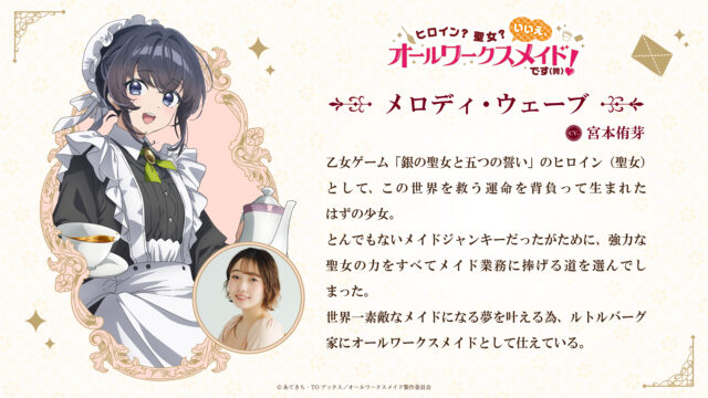 小説投稿サイト「小説家になろう」などで人気のライトノベル「ヒロイン?聖女?いいえ、オールワークスメイドです(誇)!」が、テレビアニメ化されることが分かった。EMTスクエアードがアニメを制作する。声優の宮本侑芽さんが乙女ゲーム「銀の聖女と五つの誓い」のヒロイン(聖女)として世界を救う運命を背負って生まれたはずの少女、メロディ・ウェーブ役、大久保瑠美さんが伯爵令嬢のルシアナ・ルトルバーグ役として出演することも発表された。