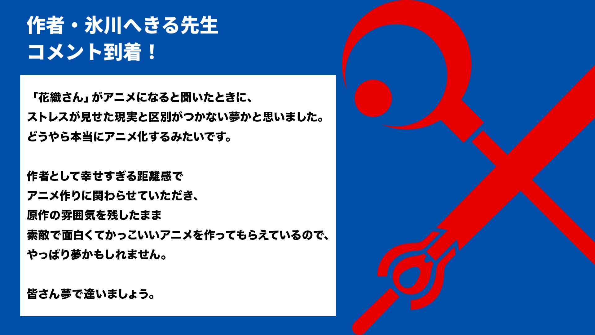 氷川さんは「『花織さん』がアニメになると聞いた時に、ストレスが見せた現実と区別がつかない夢かと思いました。どうやら本当にアニメ化するみたいです。作者として幸せすぎる距離感でアニメ作りに関わらせていただき、原作の雰囲気を残したまま素敵で面白くて格好いいアニメを作ってもらえているので、やっぱり夢かもしれません。皆さん夢で逢いましょう」とコメントを寄せている。