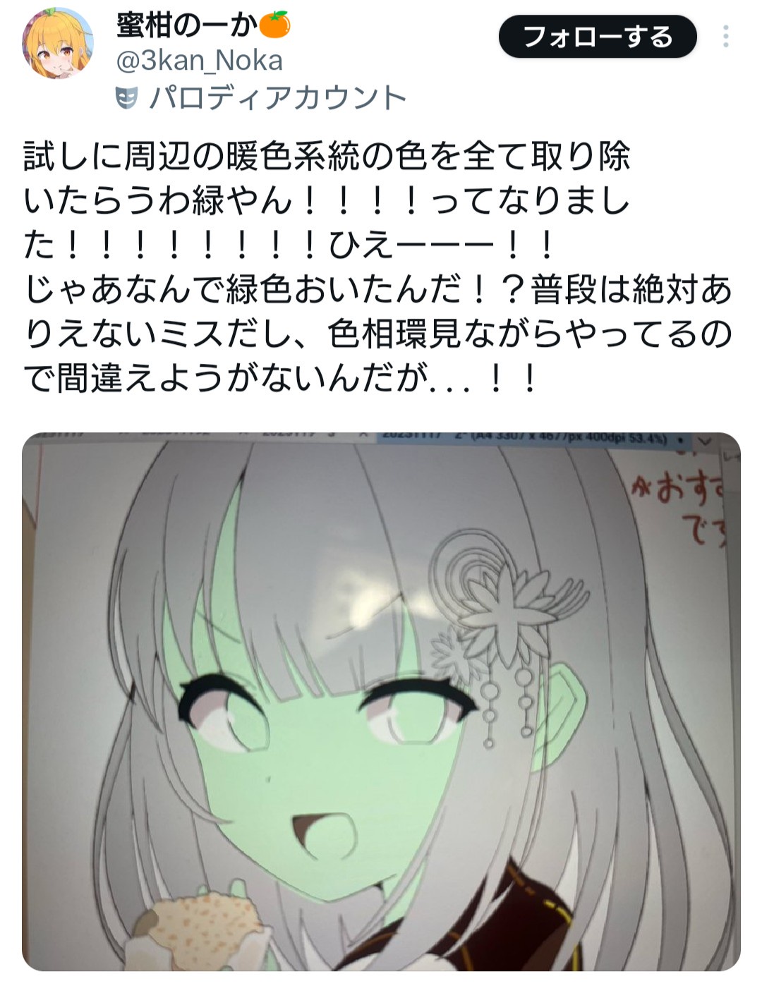 ワイも困惑したが手が緑がかってるんやな