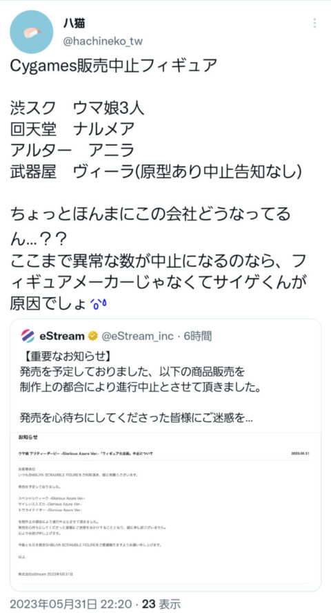 アルターもコトブキヤも中止か