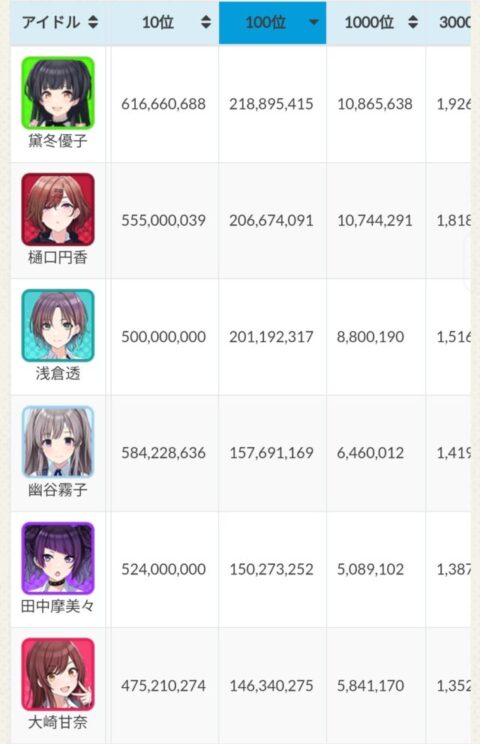 アイドル別ランキングで課金してないと取れなさそうな100位だとふゆの次の2位やな